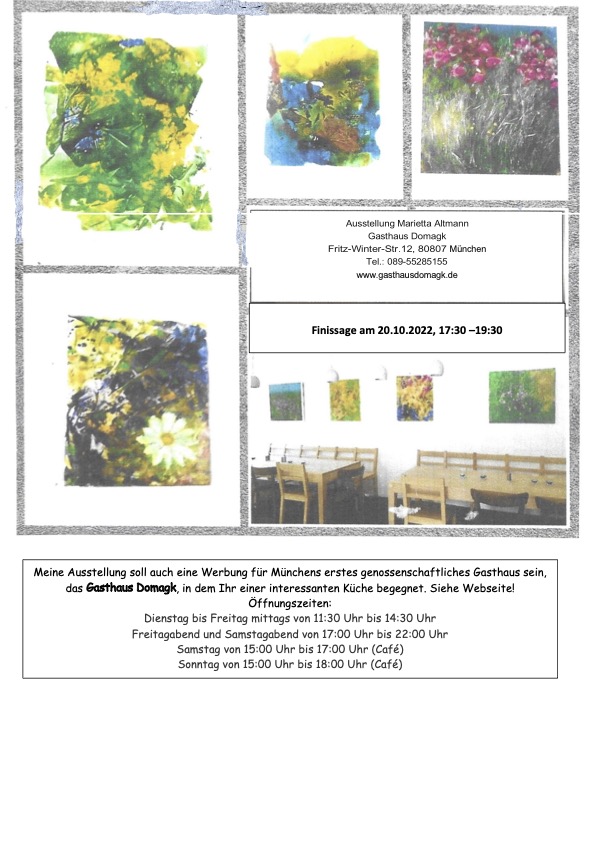Es ist die letzte Gelegenheit die Bilder von Marietta Altmann im Gasthaus zu sehen und auch zu erwerben. Das Gasthaus ist danach geöffnet und wir bieten Getränke und kleine Speisen für einen gemütlichen Ausklang des Abends an.