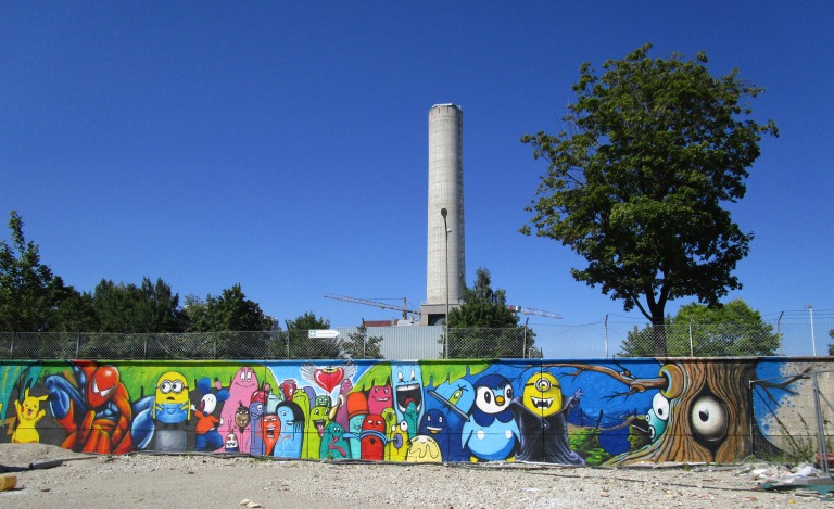 Von der tristen alten Mauer der ehemaligen Funkkaserne schauen den ersten Bewohnern des neu entstehenden Wohnquartiers Domagkpark nun ganz neue Nachbarn entgegen, welche die Kinder im Alter von 5 bis 12 Jahren selbst zum Leben erweckt haben.