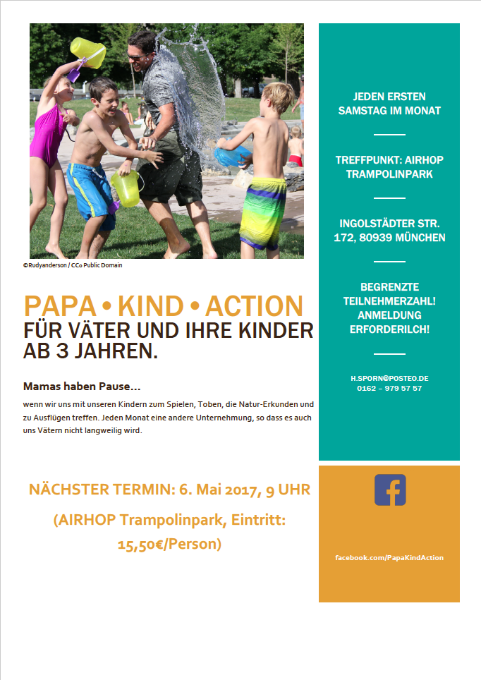 Die nächste "Papa • Kind • Action" steht vor der Tür. Am Samstag, 6. Mai, 9 Uhr, geht es zum Trampolin-Springen im Air Hop Park, München. Eintritt: 15,50 € Pro Person (leider auch für Kinder). Welche Papas sind diesmal mit Ihren Kindern dabei? Anmeldung unbedingt erforderlich!