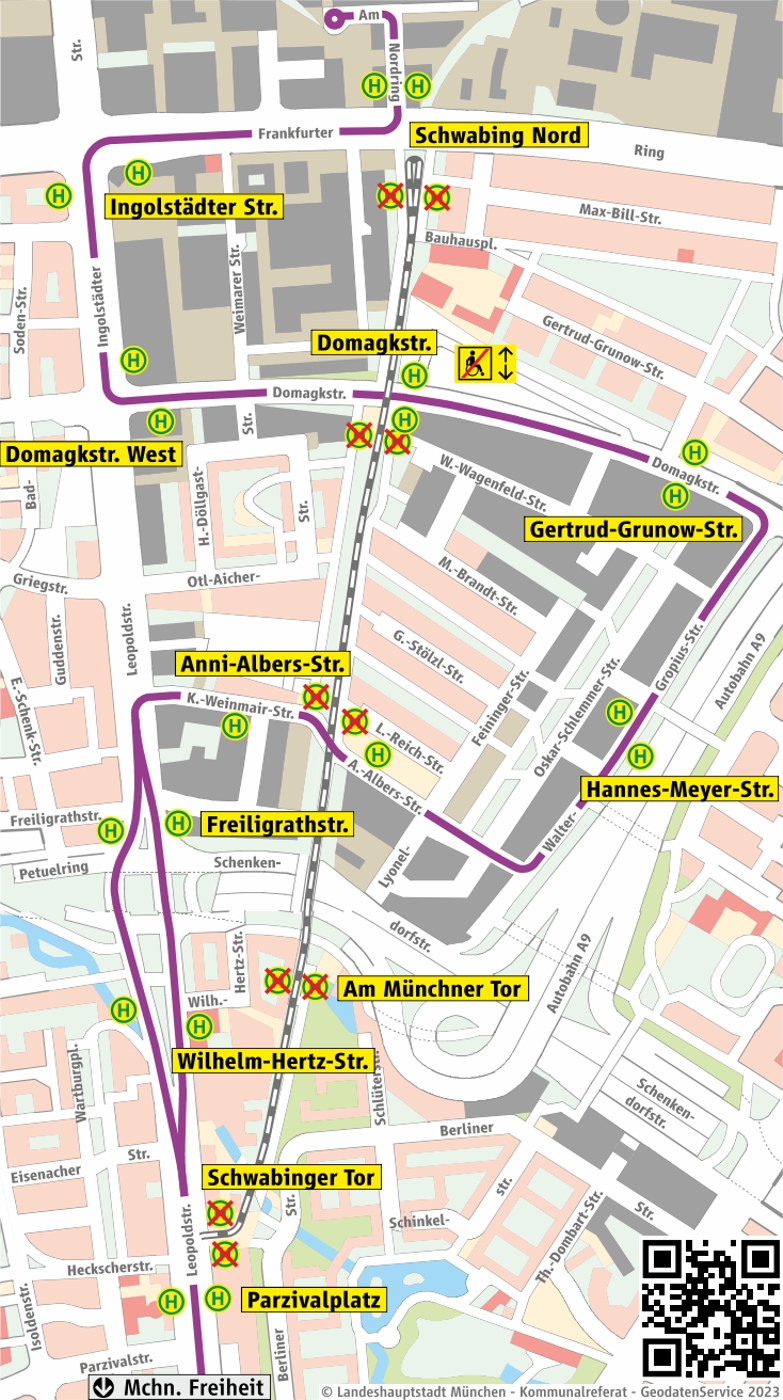 Bitte beachten Sie, dass der Linienweg der Ersatzbusse zum Teil erheblich von dem der Tram 23 abweicht und einzelne Haltestellen nicht wie gewohnt bedient werden können. Ihre Fahrzeit kann sich aufgrund des verlängerten Linienwegs in der Parkstadt Schwabing teilweise deutlich erhöhen.