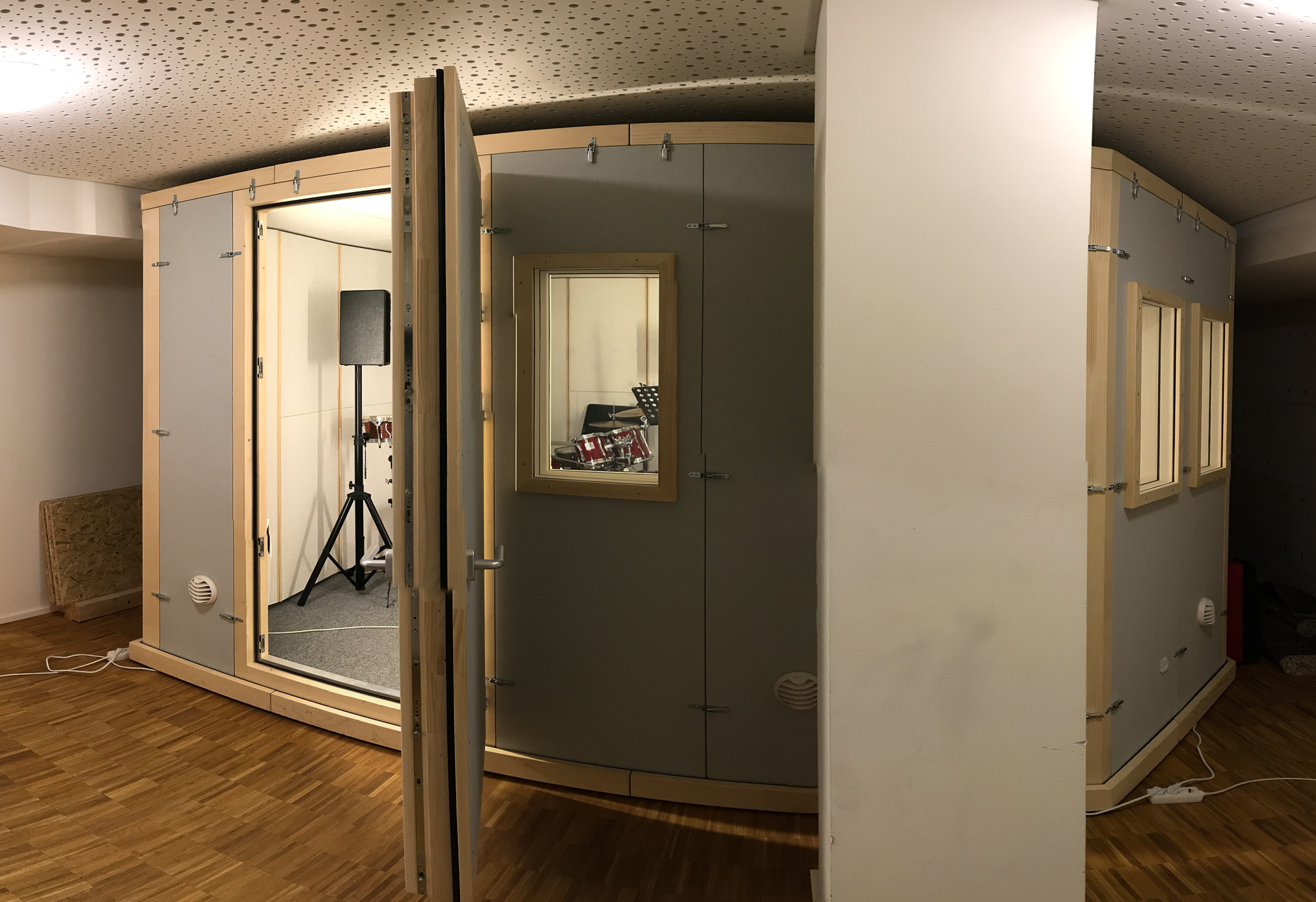Raum GELB (15 qm) mit Klavier, Raum GRÜN (20 qm) mit Klavier, Raum ORANGE (40 qm) mit Schlagzeug und PA in Studiobox (16 qm) stehen zur Auswahl.
