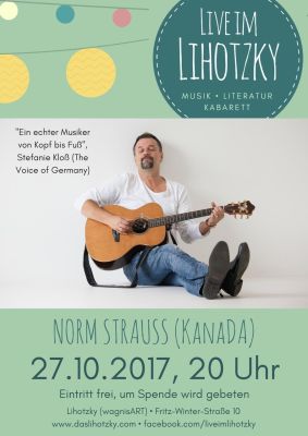 Am 27.10., 20 Uhr (Einlass: 19:30 Uhr), wird NORM STRAUSS bei uns zu Gast sein, in Deutschland bekannt geworden durch seinen Auftritt bei The Voice of Germany (https://www.youtube.com/watch?v=FDdLRWtj7DY).